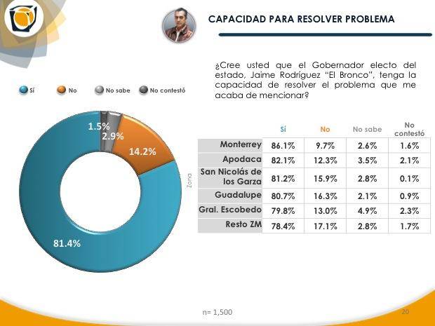 Pese a que la lista es larga y los problemas parecen muchos, el 81.4 por ciento de los neoleoneses consideran que “El Bronco” tiene la capacidad para resolver cada uno de los retos del estado.