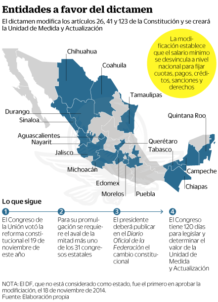 En el Distrito Federal, la Asamblea Legislativa aprobó el decreto que crea la Unidad de Cuenta de la ciudad de México para sustituir el salario mínimo desde el 18 de noviembre de 2014, y aunque no se considera como estado para avalar modificaciones a la Constitución, sentó el precedente para que el Congreso de la Unión discutiera y aprobara la desindexación.
