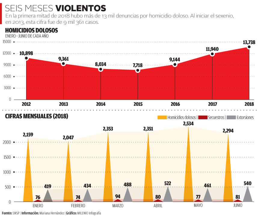 Ciudad de México.- En el primer semestre de 2018 se presentaron 13 mil 738 denuncias por homicidio doloso en el país, cifra que es superior en 15 por ciento al registro del mismo periodo de 2017, cuando el Secretariado Ejecutivo del Sistema Nacional de Seguridad Pública (SNSP) informó de 11 mil 940 casos.