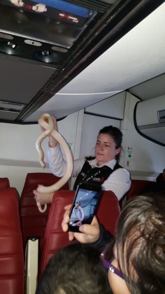 Las fotos muestran una víbora de color pálido y entre 1.30 y 1.60 metros enrollada debajo de un bolso. En otra foto, un asistente de vuelo la coloca en una bolsa de desperdicios.
