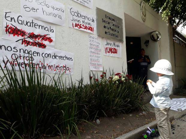En la embajada quedaron colocados cartulinas, en las que escribieron “Gobierno de Jimmy Morales asesino” o “Las niñas de Guatemala fueron asesinadas por el Gobierno de James Morales”, en tanto fueron colocadas veladoras y juguetes, en señal de duelo y solidaridad con las familias.