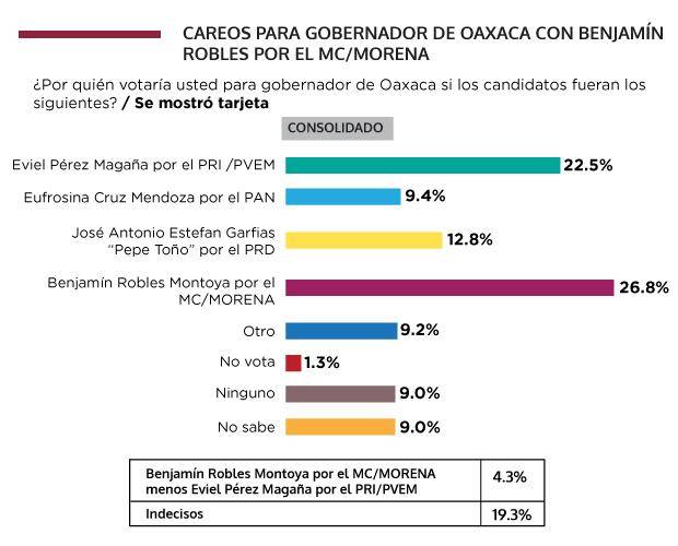 En un escenario de alianza entre Morena y Movimiento Ciudadano, Robles Montoya también estaría beneficiado por el voto frente a candidatos como Eviel Pérez Magaña (PRI-PVEM), José Antonio Estefan Grafias (PRD) y Eufrosina Cruz Mendoza (PAN).