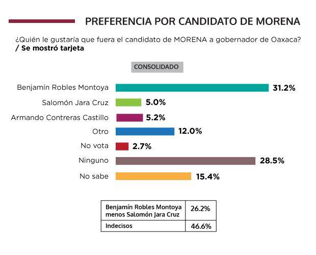 México.- Una encuesta realizada por “Opinión Pública” revela que el electorado preferiría al senador Benjamín Robles como candidato del Movimiento de Regeneración Nacional para la gubernatura de Oaxaca.
