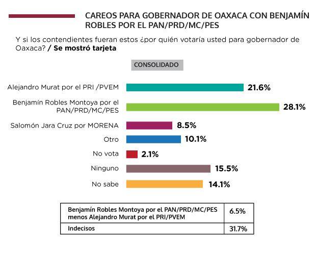 En la encuesta realizada por Desiderio Morales, Benjamín Robles presenta amplias posibilidades incluso frente al candidato Alejandro Murat (PRI- PVEM), con un 28.1 por ciento frente a un 21.6 por ciento.