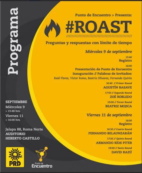 De acuerdo con una invitación difundida desde las redes sociales, la actividad que lleva por nombre #Roast se realizará este miércoles a las 15:40 horas, durante esa sesión los candidatos, Agustín Basave, Zoé Robledo y Beatríz Mojica presentarán sus propuestas.