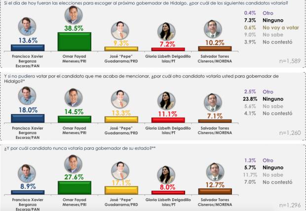 En cuanto a la intención del voto por candidato, Omar Fayad se queda con el 38.5 por ciento; Francisco Xavier Berganza, con el 13.6 por ciento; Salvador Torres Cisneros, 10.2 por ciento; José ‘Pepe’ Guadarrama, 9.3 por ciento, y Gloria Lizbeth Delgadillo, con 7.2 por ciento.