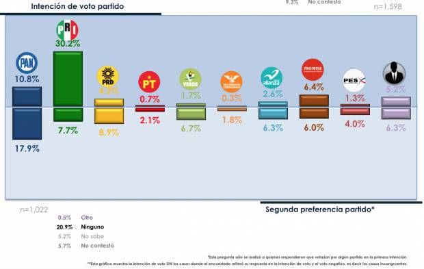 El estudio, aplicado del 2 al 5 de abril de 2016, a mil 600 personas, arroja también que en cuanto a la intención del voto por partido, el PRI se queda con el 30.2 por ciento; el PAN, 10.8 por ciento; Morena, 6.4 por ciento; PRD, 4.2 por ciento, y Partido Verde Ecologista de México (PVEM) 1.7 por ciento.