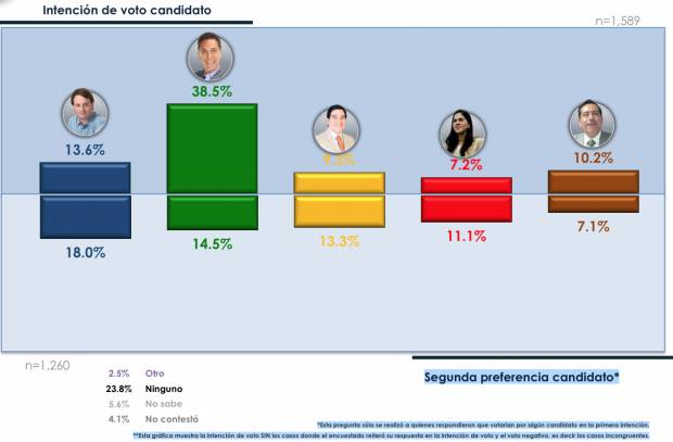 En tanto, el 13.6 por ciento lo haría por Francisco Xavier Berganza Escorza, del Partido Acción Nacional (PAN); el 10.2 por ciento votaría por Salvador Torres Cisneros, del Movimiento Regeneración Nacional (Morena).